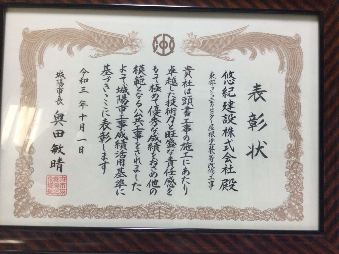 この表彰を励みに、今年度も京都府城陽市の皆様に愛される総合建設会社になれるよう精進して参ります。