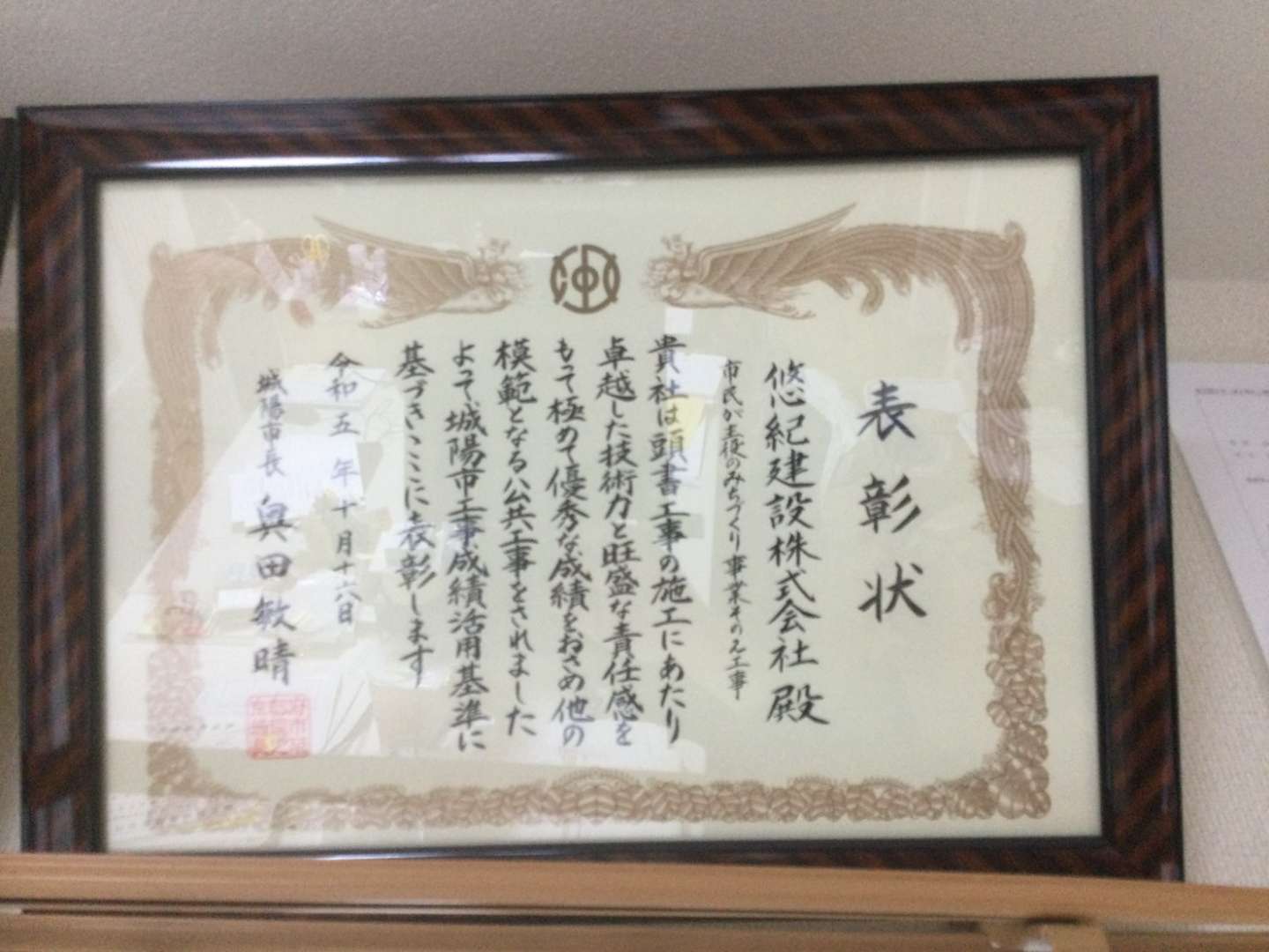この度、弊社は城陽市より優良工事者として表彰されました。対象工事は「市民が主役のみちづくり事業その2工事」で、昨年に引き続き2年連続の受賞となりました。